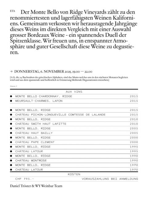 In unserem Degustationsraum «Raum Stefan», mit Platz für bis zu 10 Personen, laden wir Euch ab 2025 zu einer Reihe einmaliger Degustationen unter der Leitung unseres Sommeliers Daniel Tröster ein.